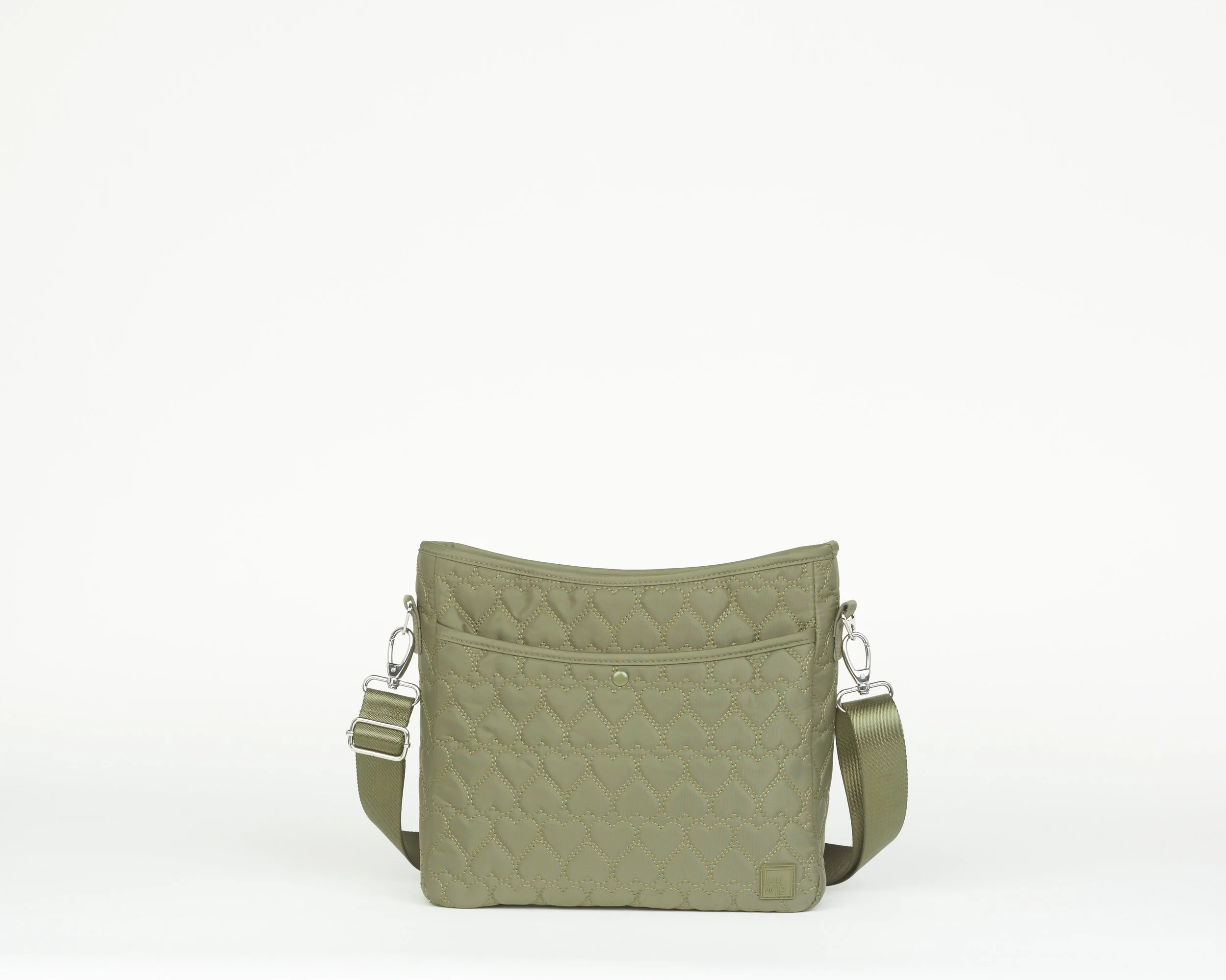 WHAT'S NOT TO LOVE ABOUT THIS CONVERTIBLE CROSSBODY BAG? COVERED IN A HEART-SHAPED QUILTED PATTERN, IT'S THE EPITOME OF FASHION AND FUNCTION, WITH A BUILT-IN WALLET, CARGO POCKETS, AND A KEY LEASH.