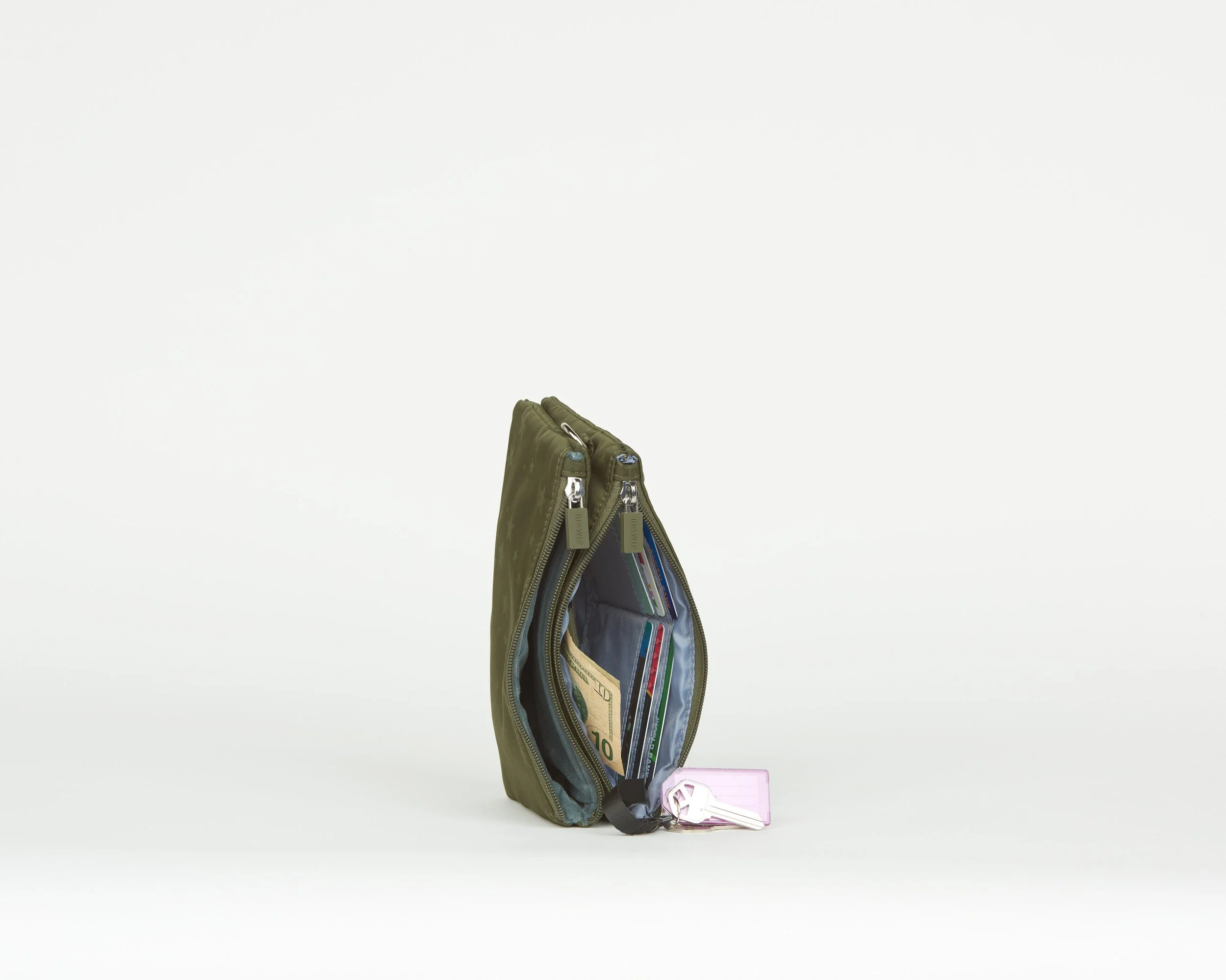 - Main zipper compartment with key clip leash, 2 elastic cargo pockets, & zipper pocket